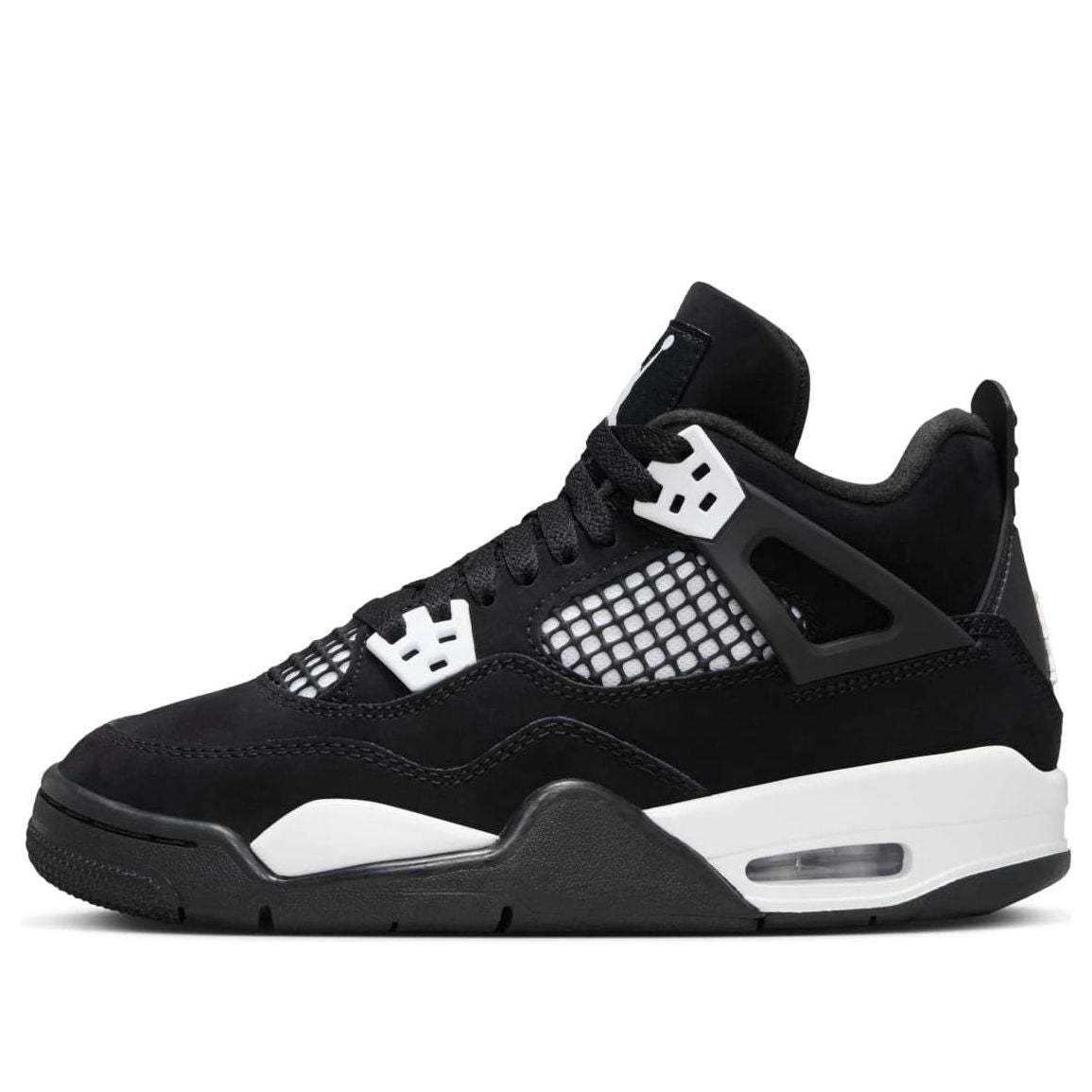 Relive the classic with the Air Jordan 4 'White Thunder'. This iconic colorway returns with a black suede upper contrasted by crisp white accents. The iconic mesh netting and signature Jumpman branding complete the retro look. Offering comfort and style, this Jordan 4 is a must-have for sneakerheads and basketball enthusiasts alike.