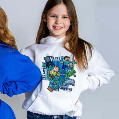 Your little gamer will love creating, exploring, and surviving in the Minecraft world while wearing this Minecraft Caves & Cliffs Create, Explore, Survive Kids Hooded Sweatshirt. Featuring an array of Minecraft Caves & Cliffs characters, this hoodie will become a favorite look for any Minecraft fan.