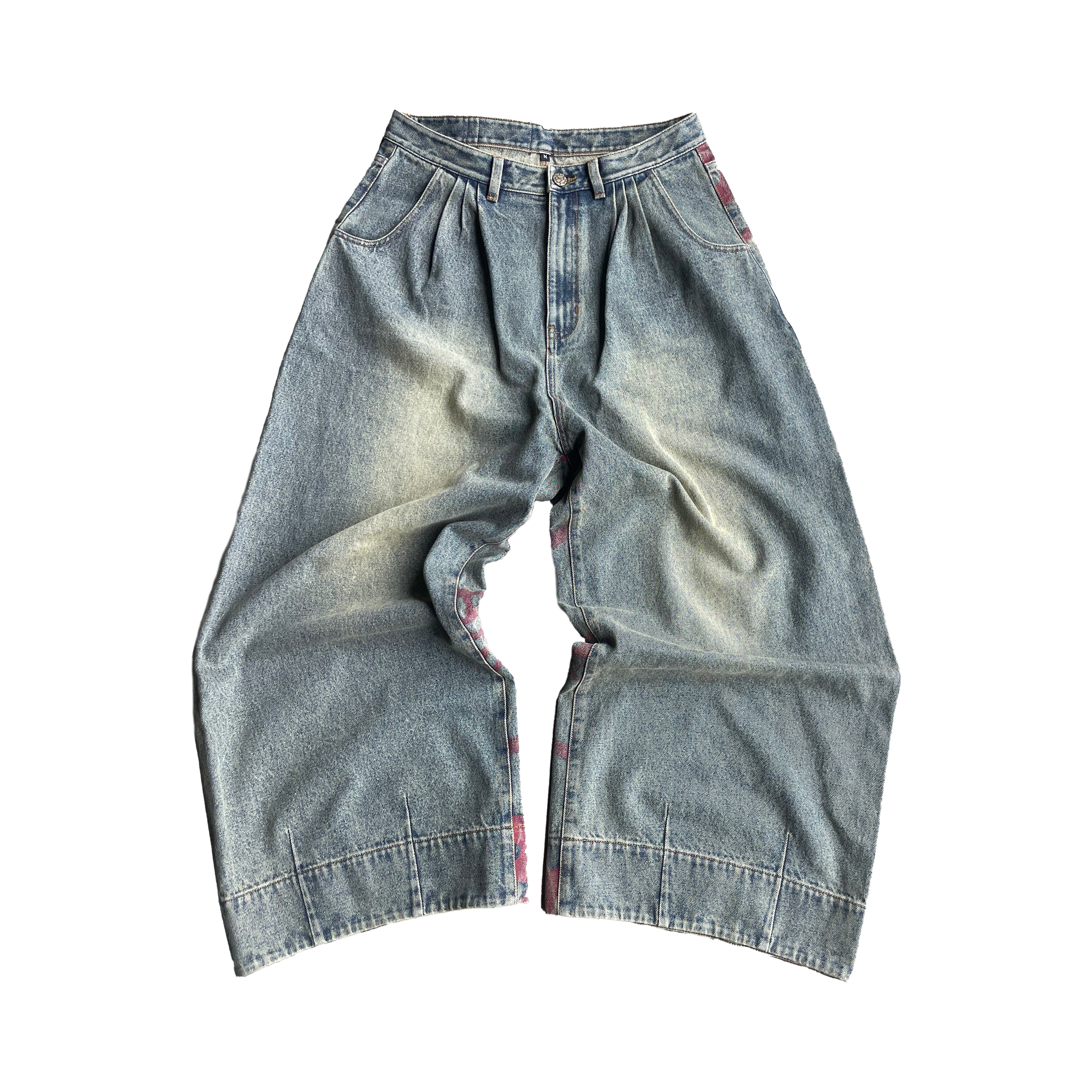 Shadow-dyed fading on front, contrast logo patch at waist